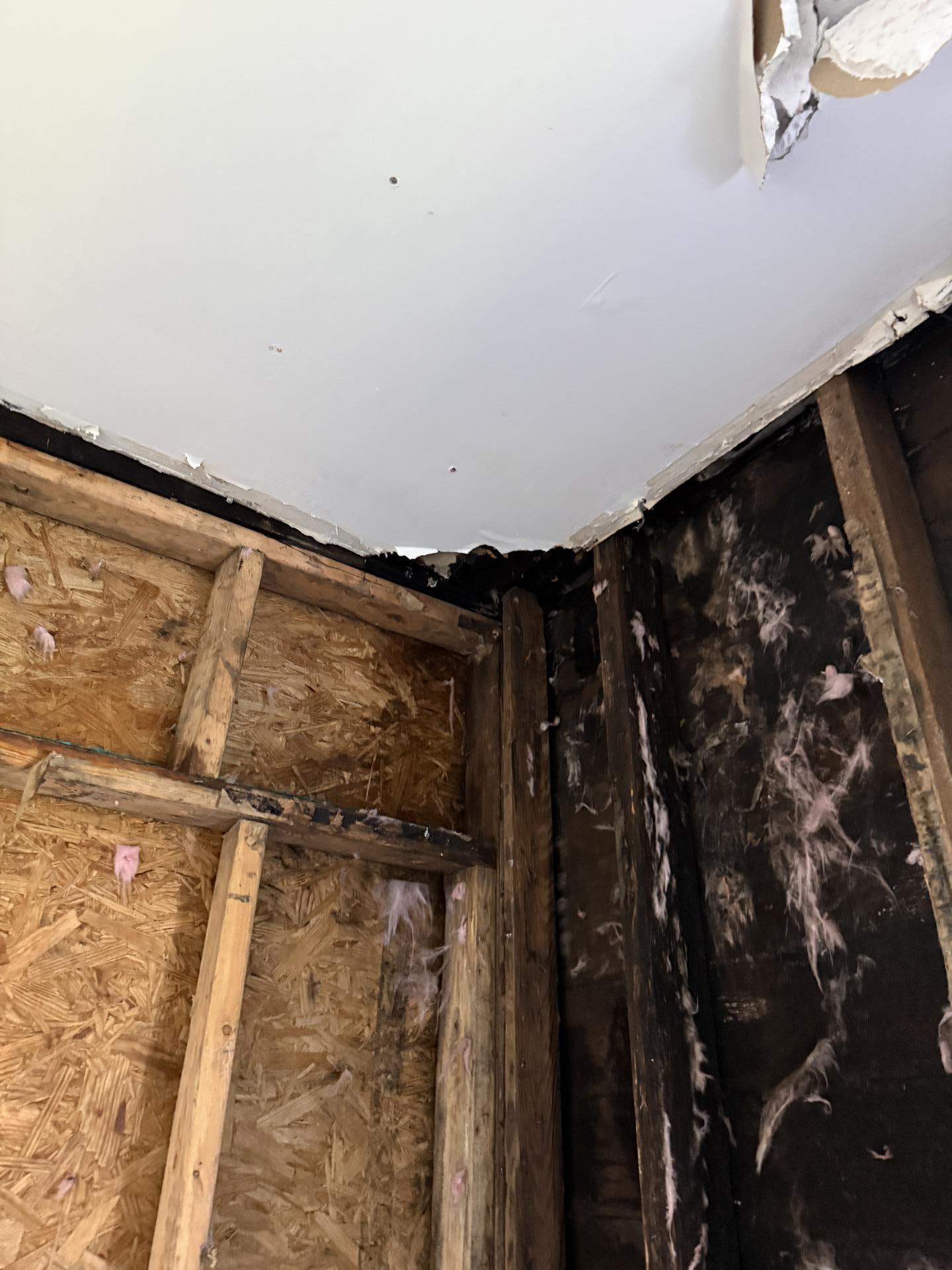 Our team provided comprehensive water damage restoration services. This involved an initial assessment and clearing of the affected area, followed by water extraction and thorough cleaning using specialized equipment like the Syclone ONE vacuum. We performed targeted demolition to remove all compromised drywall, exposing the underlying damage. Subsequently, we addressed extensive mold growth on the wooden studs and sheathing through professional mold remediation, preparing the area for reconstruction and ensuring a healthy living environment.