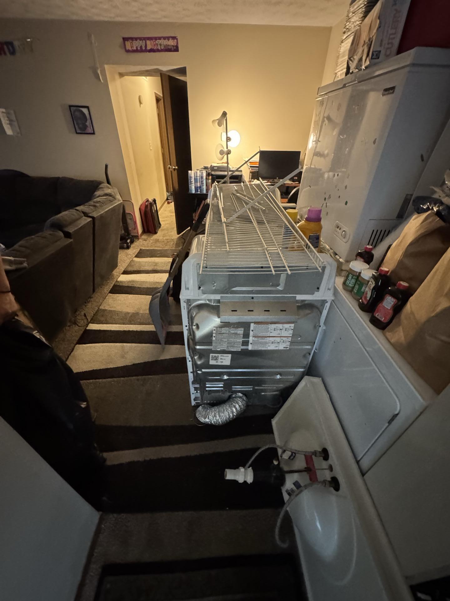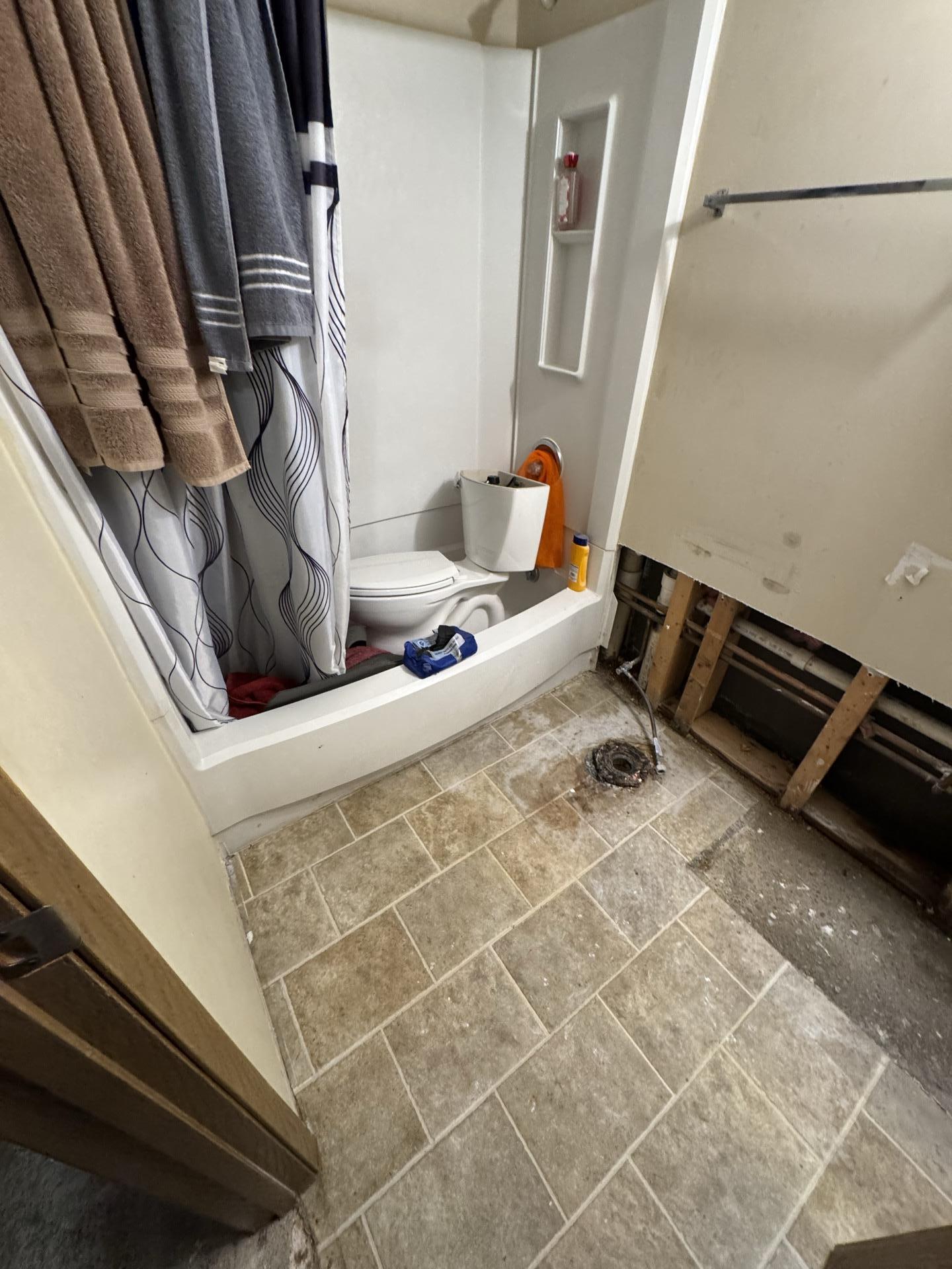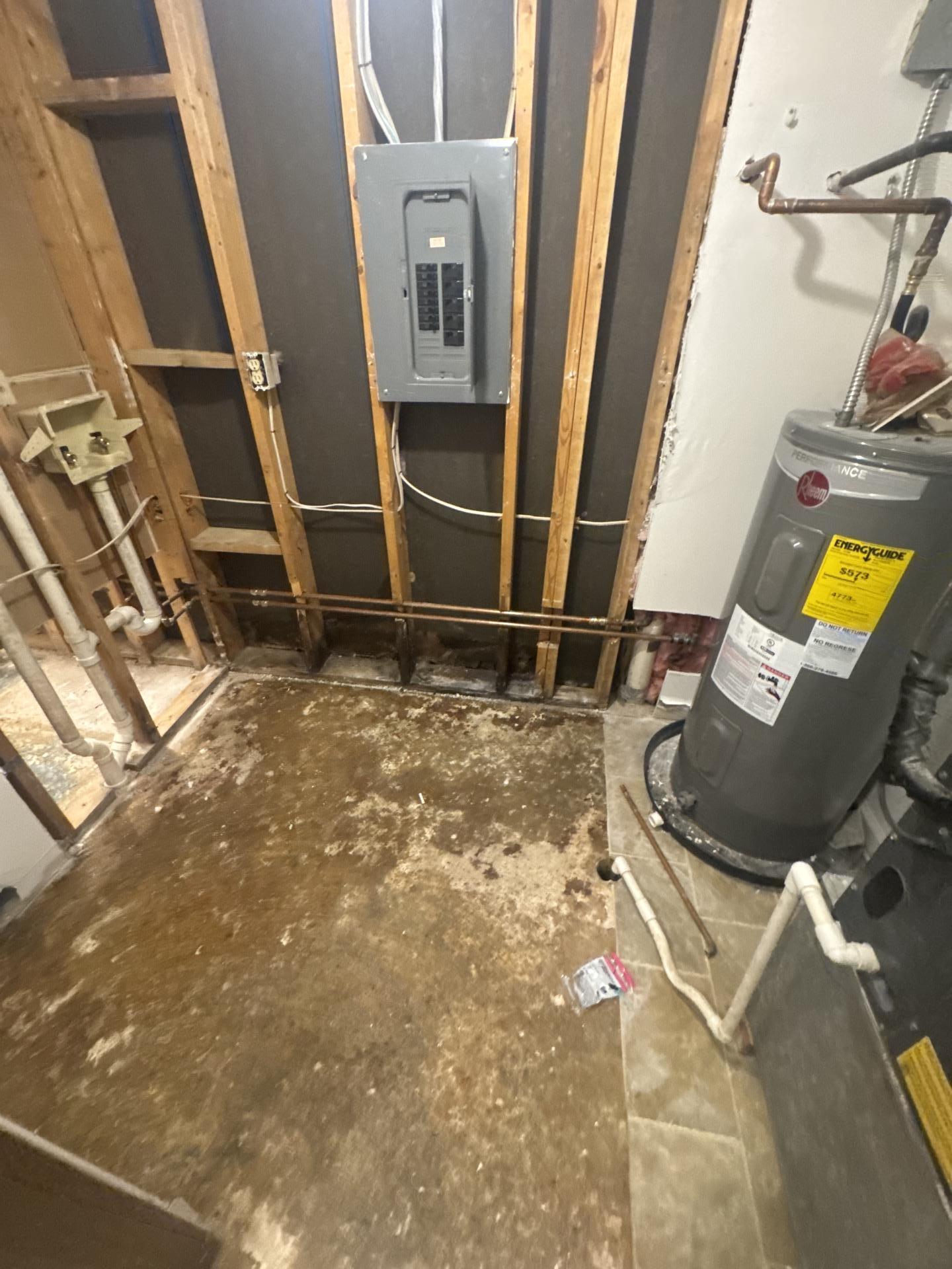Teasdale Fenton responded to the customer's water damage issues by conducting thorough water damage restoration. This involved strategically moving appliances, such as the dryer in the laundry area, to gain access to affected zones. Our team performed extensive demolition, carefully removing damaged drywall and flooring in the bathroom and utility areas to expose the affected subflooring and structural elements. The visible exposed studs and piping indicate a comprehensive effort to dry out and remediate the water-damaged materials, preventing further deterioration and potential mold growth.