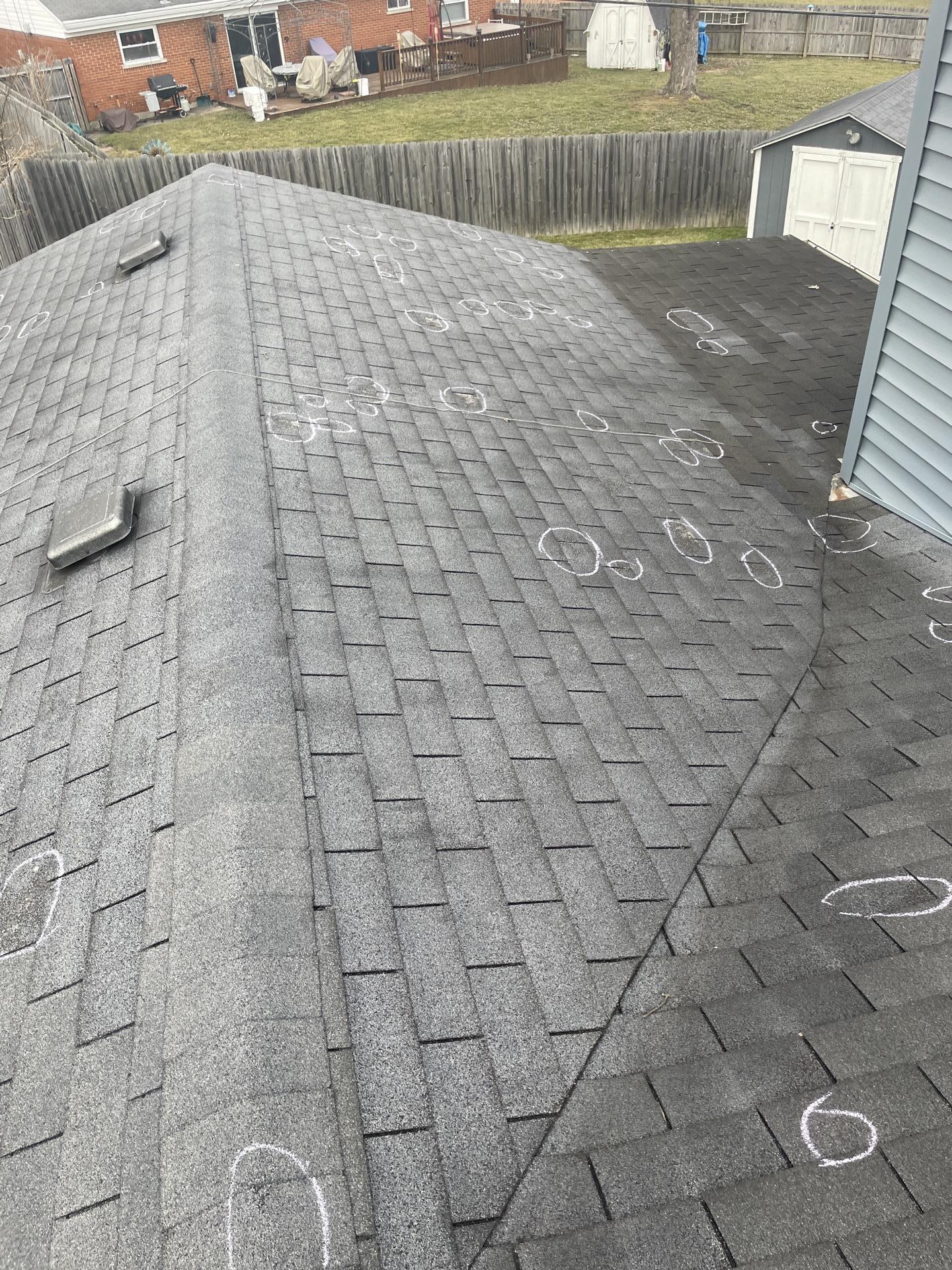 A detailed roof inspection was conducted, meticulously identifying and marking numerous impact points consistent with hail damage. The process ensured a professional assessment, and the site was left in an organized state upon completion of the inspection.