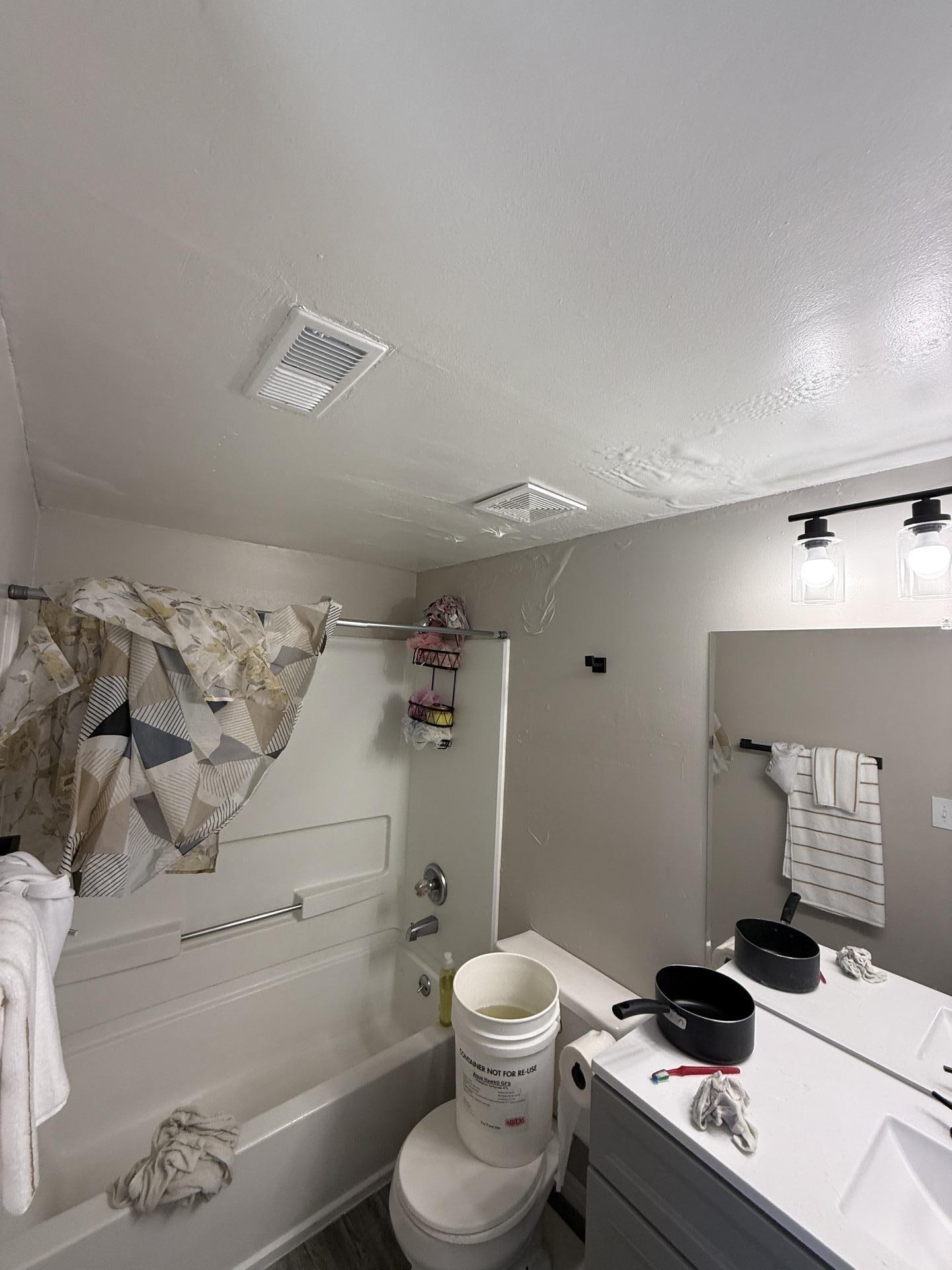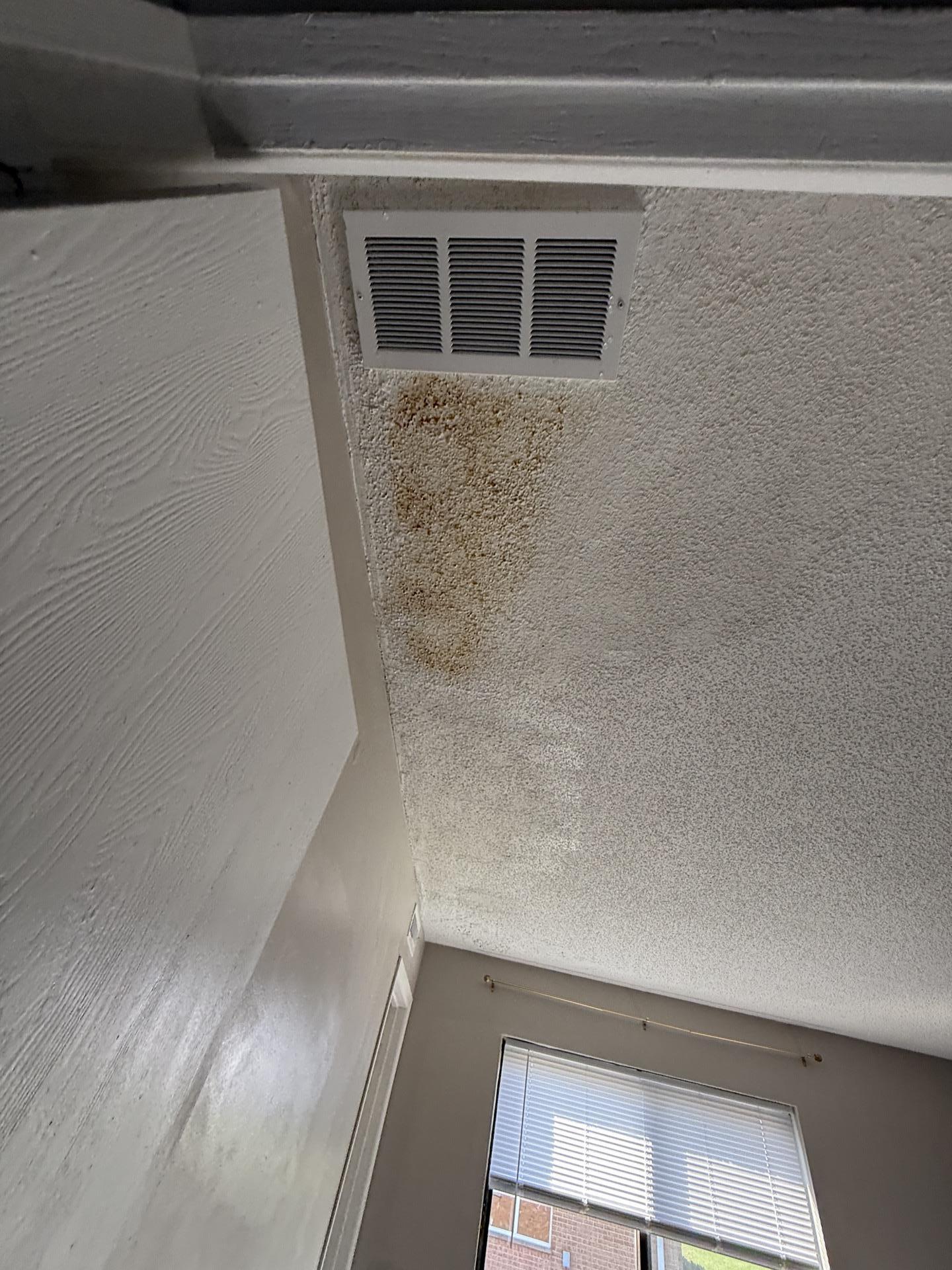 The customer experienced significant water damage, evident by staining on the ceiling, particularly around a vent, and water accumulation in the bathroom.