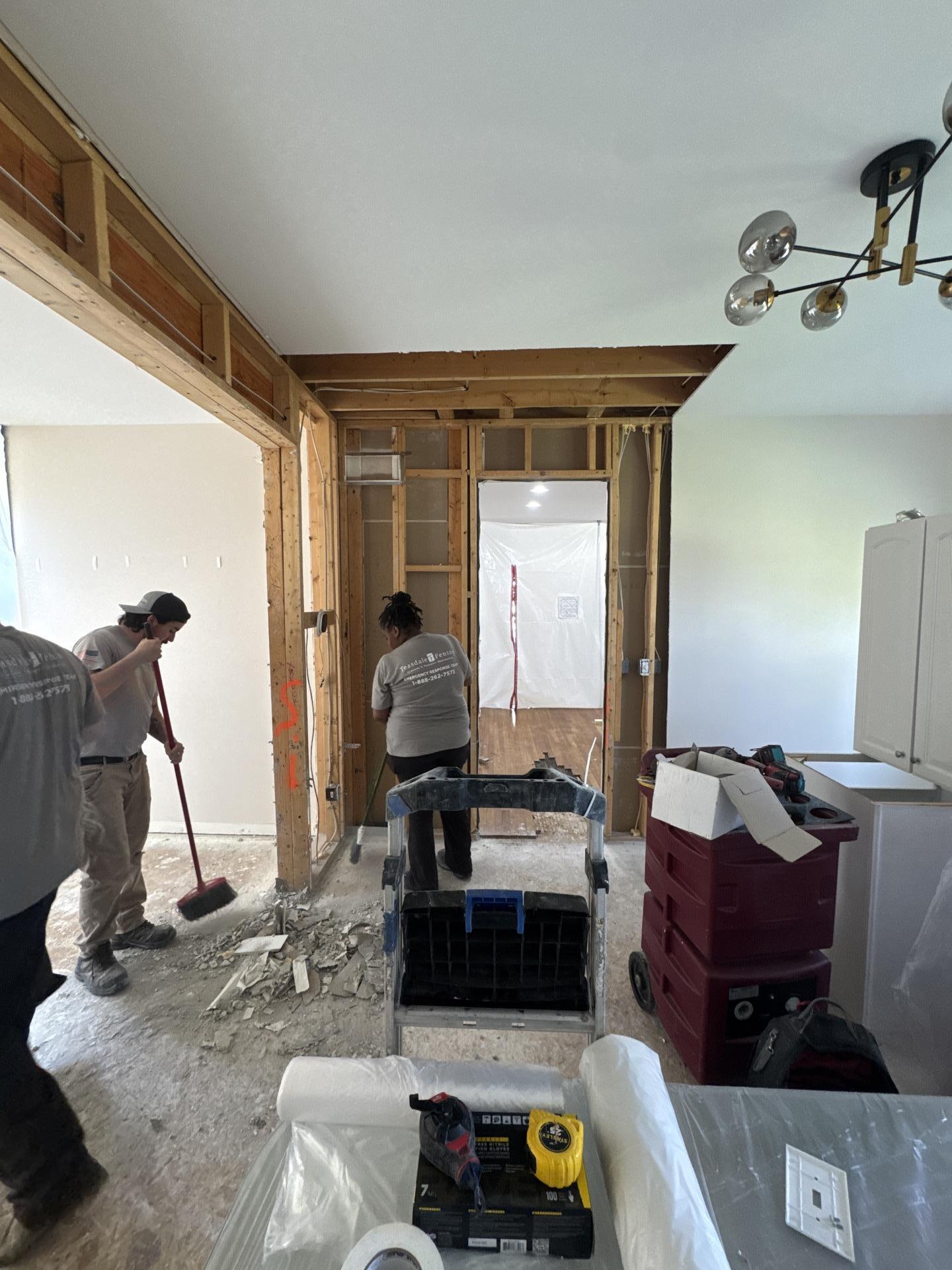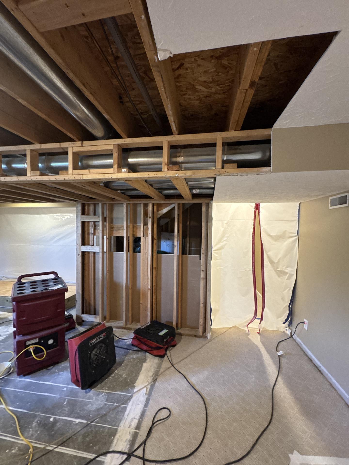 Our team implemented a comprehensive water damage restoration and structural drying plan, including, Demolition & Exposure: Removed damaged sections of hardwood flooring and drywall to expose the subfloor and wall studs for direct drying. Site Containment: Installed plastic vapor barriers to isolate the affected work area, maintaining air quality and drying efficiency in the rest of the home. Industrial Drying: Deployed high-capacity air movers and LGR (Low Grain Refrigerant) dehumidifiers to extract deep-seated moisture from timber framing and subflooring. Debris Removal: Conducted a thorough site cleanup of building materials to prepare the space for the final reconstruction phase.