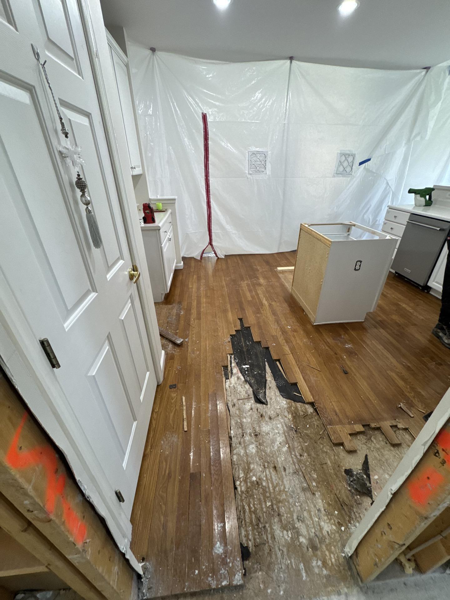 The customer contacted us due to a significant indoor water intrusion event that caused visible damage to the hardwood flooring and subfloor. The presence of moisture necessitated professional intervention to prevent structural rot and mold growth. Based on the kitchen setting, this was likely caused by a localized pipe burst or appliance failure that saturated the flooring and seeped into the wall cavities.